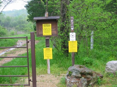 From St. Louis, take I-44 west to the Hwy 50 exit. (Exit 247) Follow Hwy 50 west to Hwy 28. Turn left and continue on Hwy 28 to the city of Bland. In Bland, turn north on Route A, which has a sharp right and then left turn, and follow, passing Rehmert Road, to a little road right next to a mobile home (it looks like a driveway) and turn right. This road has no name, but just before the turn, MDC has a sign there. You can see the mobile home’s ENS number sign which is A2 280. Follow that road to the first parking lot on the left or go a little further to the lot at the end of the road. This road is steep at the end.