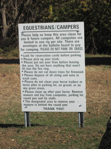 There are new camping and parking rules. All of the back-in slots in the large parking area are for camping only. No day use parking in those slots. If you park there you need to pay the camping fee. Day use parking, as well as primitive camping spots are back in the wooded back camping area. You can also park in between the camping slots for day use, just do not block the camping slots. They have also added manure bins, wheel barrows, and manure forks. Please clean up after your horses in the campsites and trailhead parking.