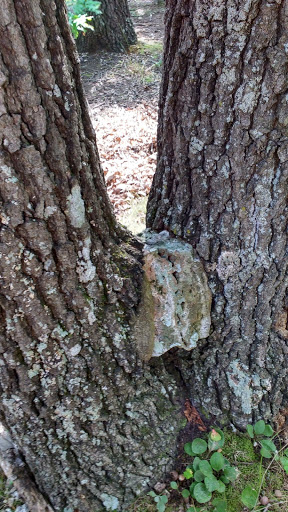 | This is near the bench. There are couple trees in this are that have a rock like this growing in the middle of the crotch of the tree. |