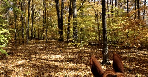 The changing leaves of the season can provide you with breath taking colorful vistas to enjoy, but as the leaves start to fall, you might find the trails a little harder to follow when the forest floor is covered with the dried brown leaves. What was once an obvious trail of dirt is now confusing because of the leaf coverage. If the trail is not well marked with signs on the trees, you might find yourself lost. That is why it’s very important to have a map and compass with you, and know how to use it. Even trails you ride a lot and think you know well can look like a trail you have never visited before without that little dirt track to guide you. Other possible problems to be aware of is the fact that the leaves can cover and hide snakes, yellow jacket nests, holes, or uneven and unsafe footing on the trail. Of course, you also might find your horse to be more “spooky” because of the extra noise, especially if combined with a windy day.