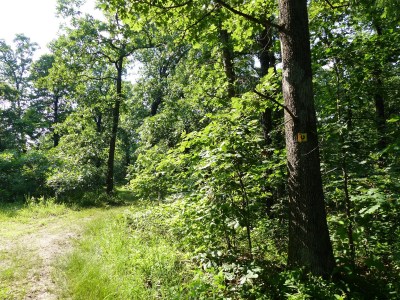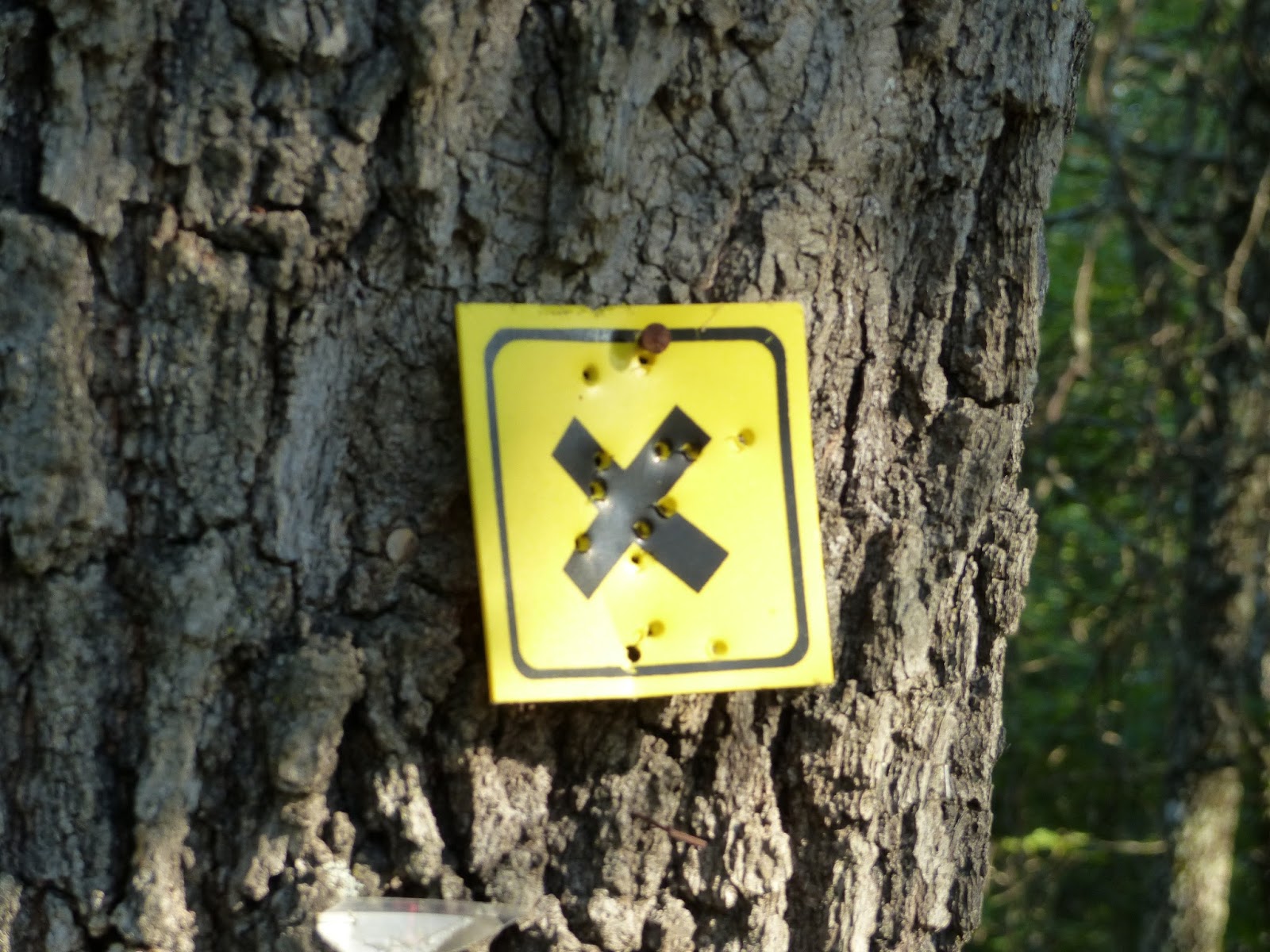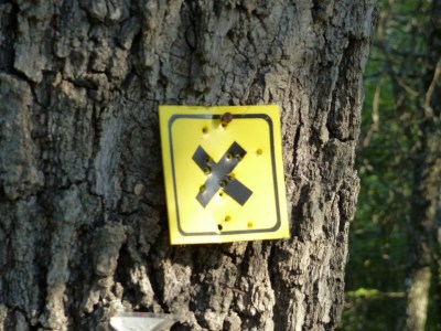| Even though MDC’s trail map color codes the different trails, this is how the trails are marked. All blazes are yellow with different symbols on them. |