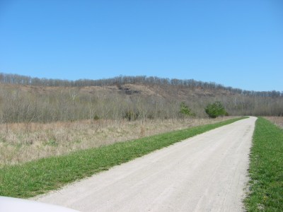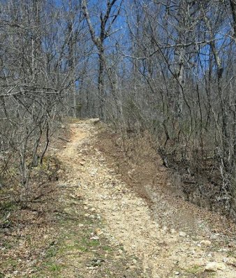 Gravel Road: About 5.5 miles. The main gravel road that runs down the middle of the trail system is about 3.5 miles long and gets VERY steep at the end when it goes down to the Niangua River. At the last road on the left, there is a warning sign about how steep it is and you can use the gravel road/yellow trail to turn around so you don’t have to go down it. If you have a trailer, it would be very hard to get back up it.
