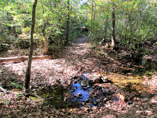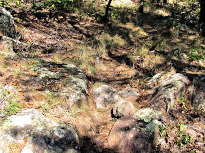 This trail is blazed in yellow, can be steep and very rocky, with bluffs and drop-offs next to the trail. The connector from the trailhead to the loop is newer than the rest of the trail and runs along a creek beside the campround. In periods of rain, this portion of the trail will likely become muddy or flood. Once you pass that area, the trail starts uphill. For the next mile, you have a long, steep, hill to climb. At the top of that hill is where the trail splits. The good news is, at the end of your ride, when your horse might be tired, it’s all downhill to the end. The trail passes through fragile glades in some areas, so please stay on the designated trail. There is a spur trail to the Ozark Trail, but equestrians are not allowed on either. A hiker we ran into said he got confused at that part of the trail, so be aware that it MIGHT be confusing where the Goggins and Ozark Trail intersects. The trail is well marked and easy to follow most of the year, but can get overgrown in late summer. The trail tread is a very narrow single track in some places and I could see the trail totally disappearing in various places when fall leaves are on the ground. This is another trail with a population of feral hogs to watch out for.