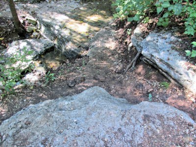 | Looking back down the hill at the boulder, you can see the trail has a muddy spot. There were muddy places here and there even though it hadn’t rain in a long time. |