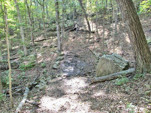 Connector Trail: (.5 of a mile) This trail connects the Flint Quarry Trailhead to the Chubb Trailhead. It goes in and out of creekbeds, and when we were there, a large tree trunk was down over the trail and creek that would be almost impossible to ride under, you’d have to 4-hoof it through the woods around it. There was no official re-route that we could see while we were there.