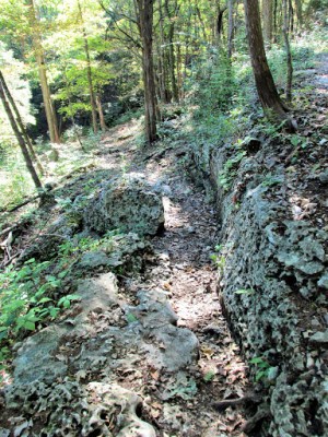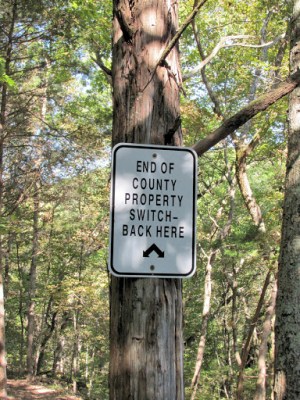 | This narrow passage through the rocks is just past the sign. I can imagine this would be a tight fit for me to ride my draft pony Haffy through. It’s also going downhill at the same time. |
