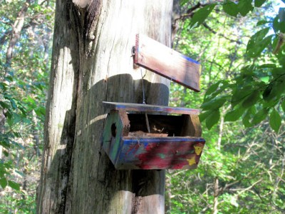 | This birdhouse is a fun little thing to see along the trail and has been here a long time, but has seen better days. Hopefully someone will replace it with a new one. |